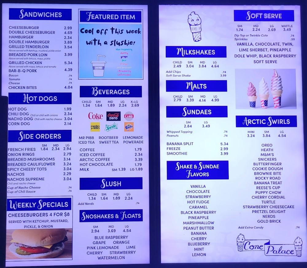 Cone Palace offers a diverse menu designed for everyone. Start with classic quick bites like cheeseburgers and coney island hot dogs. Priced around $2 to $4, they cater to those wanting a hearty meal without stretching the budget.